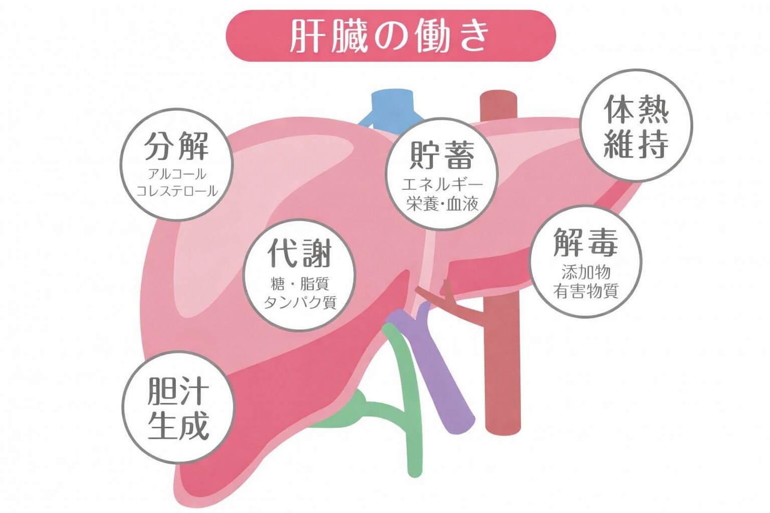 肝臓の働きが低下すると、体では次のようなことが起こります。